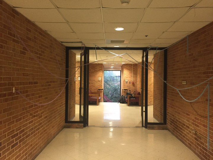 There seems to be a theme of having mysterious/imposing figurative sculptures throughout the Rowe building for various classes (such as the hand coming out of the ceiling and my own crocheted dolls, each from last semester for Fibers 1). The figures were intended to be standing, but we’d made them so big that we elected to have them float in the air. I think it makes for a nice effect in that their “imposing” nature may stem from taking up so much space in a narrow hall.