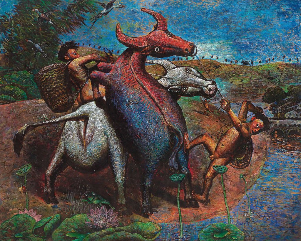 This is another example about his research in peasants and trying to get his audience to look into history and understand this piece. The medium he used is Oil on canvas. The colors he uses in his paintings are correlated to a palette that he uses for most of his paintings. The reason for this is because of religious motifs. In this painting, he uses red and blue for the buffalo. This symbolizes the strength and rage in the buffalo.