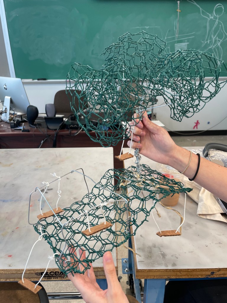 The way in which we created the base was by using chicken wire and folding it to make it stronger. The color of the chicken wire is green so, that helped our line installation to represent grass we also rolled up some chicken wire into balls to create somewhat of a leaf-like appearance to the trees. For the trunk and the branches, we used some random silver wire that was pretty malleable. For the roots of the tree, we wrapped twine around some of the silver wire that was used for the branches. We then created some swings that would hand from the tree, the swing set, the branches, and the roots.