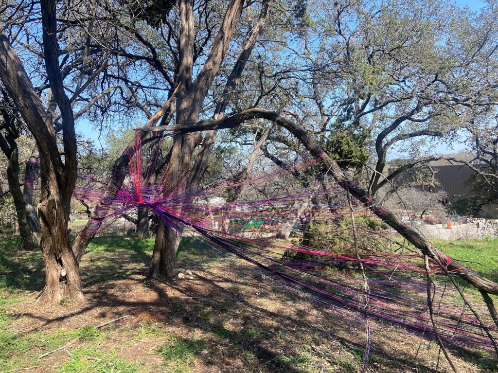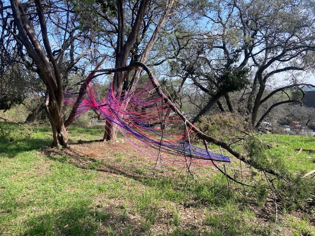 I knew right off the bat that I wanted to work with yarn and a tree so I found a like-minded partner. Together, we came up with the idea to create a “portal.” We decided to use purple and black yarn to contrast the natural green and brown colors of the site. We found a tree we liked (with a broken branch) and decided to do something to mend the broken branch back to the tree.
