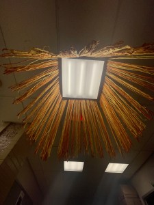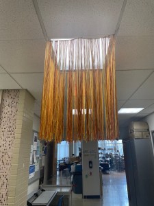 For our line project we knew we wanted to work with yarn and light fixtures. Our original plan was to use balloons to cast molds of yarn dipped in glue, to then create a cage-like fixture around a light source. The yarn cast didn’t turn out like we hoped, so we then decided to create a wireframe and string yarn from. We used yellow and orange yarn in a random pattern and then trimmed then roughly to even lengths. We wanted it to engage with the light, space and each person that walks underneath it.