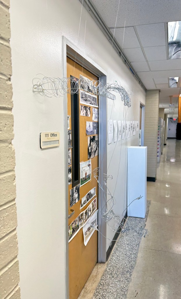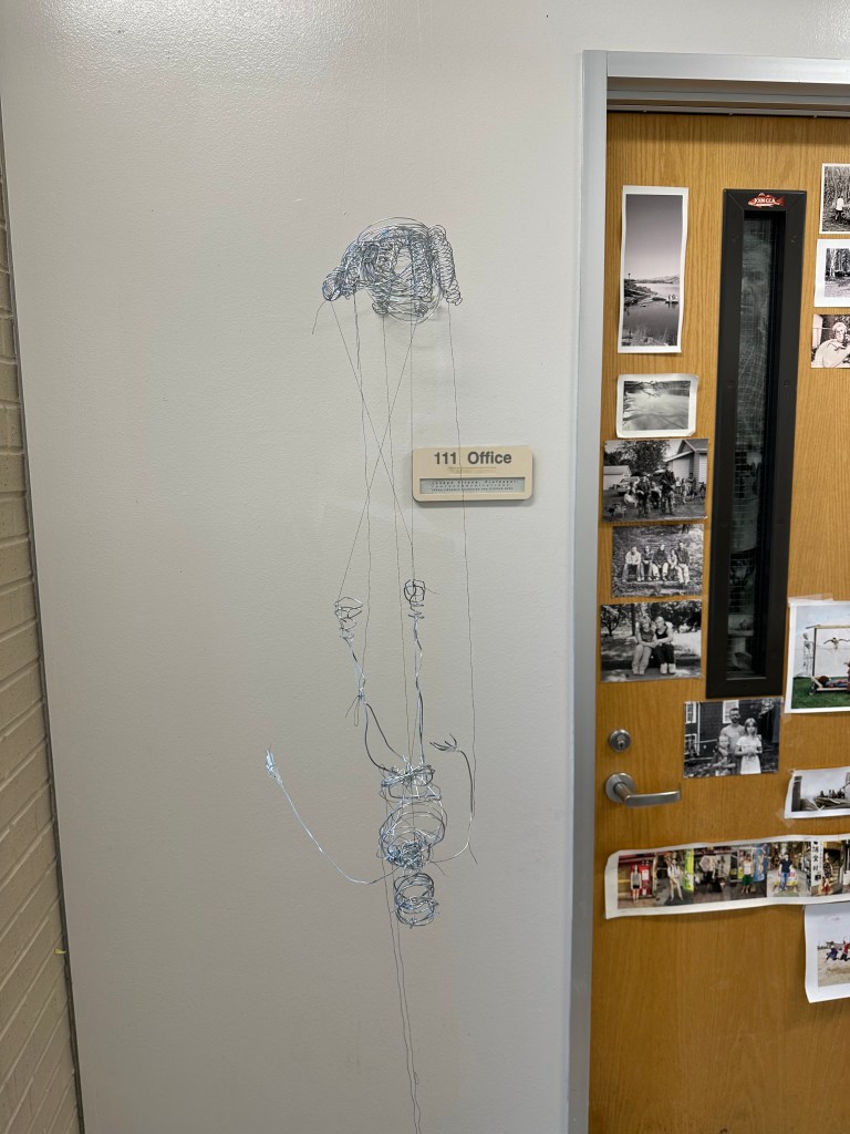 Our idea for this project was to create a story through a hand “controlling” a puppet. The puppet figure is sculpted to be falling down with some strings cut from the hand. This demonstrates the puppet escaping from their controller. We wanted to use line both in the strings as well as the wire figures. We went with a continuous line sort of blind contour style for the figures to give it more “line” qualities. We had initially wanted to install this just laying on a surface with a counter weight in the arm. We then had some help coming to the conclusion that it would look better coming out of the wall. We reinforced it with fishing string holding it from the ceiling, as well as thumbtacks holding it to the wall.