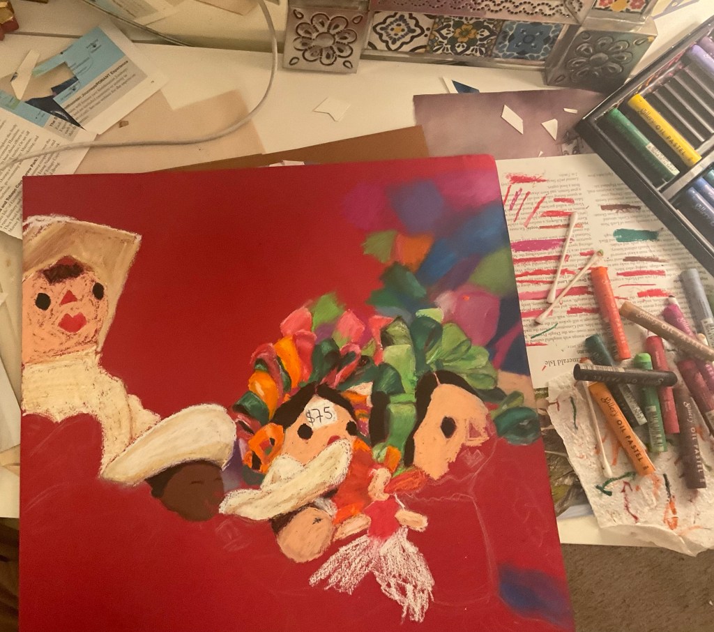 This photo was taken using a 5o mm camera lens which allowed for the deep depth of field. I thought this photo was perfect for this atmospheric perspective project because of how in focus the dolls are. I chose oil pastels as my medium because of the softness, variety of colors, and easy smudge effects used to create the blur effect. I began with a thumbnail sketch. I later outlined the drawing on a red piece of paper using a white colored pencil and finally, I went in with the oil pastels. I used q-tips to blend colors, especially in small detailed areas such as the bows.