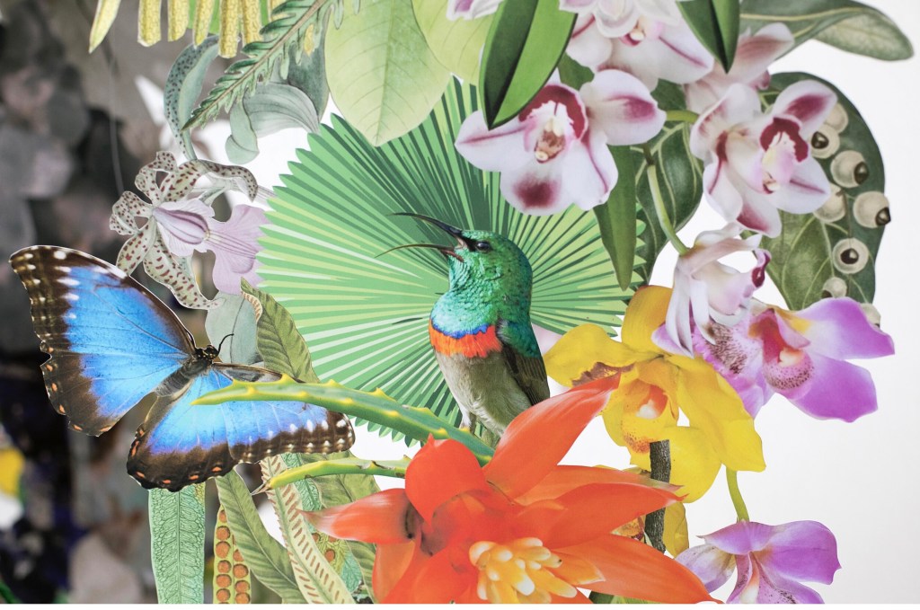 Berlin based collage artist, Clare Celeste Borsch is not only an artist but also an environmentalist. Her installations show great appreciation for our planet’s ecosystems and biodiversity. Through this appreciation she also hopes to bring awareness to the topics of climate change and the prevention of more biodiversity going extinct. In an interview she states that her artwork is a reflection of her love for nature. Fascinated by “the connections between organisms, the intricacies of ecosystems, and the complexity of nature…” she has created her most recent work of art and installation: Biodiversity. This is an immersive art installation made of hand cut paper images of flora and fauna. Borsch states that flora and fauna are reminders that we are “inextricably connected to the larger web of life”. Her ideas stem from having grown up all over the world. She adds that because of this, her life has been a collage of sorts: “For me, it makes sense to collage a Brazilian butterfly next to a North American flower. In my mind, they are intrinsically connected.”