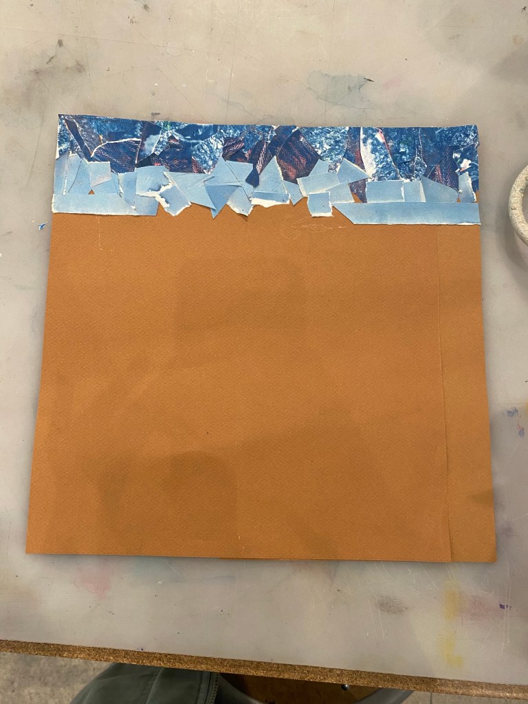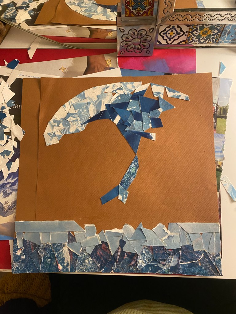 For my collage project, I made use of some old cyanotype photographs and paper, other blue hued papers found in the lost and found box, magazine paper, and oil pastels. I began by cutting the cyanotype photographs into small, random shapes and later doing the same with the rest of blue hued papers. When I began laying the blue pieces down i started with one color (as you can see the darker blues are all together, the lighter ones together and so one) overlapping each other because I love textured art so I knew I wanted to have these random shapes over lapping one another. When I followed with the lighter pieces of blue I still didn’t really know what I was going to create… was it going to be a sky (it was giving sky)? A wave? Add a wave it was. I drew an outline of a wave and continued filling it in with the little cut pieces of textured blue paper. I wanted the textures and different colors of blue in the wave to be uniformed and have some form of harmony so I tried adding different colors of blue (light, dark, textured, not so textured) here and there to tie them all together. To add a one pint perspective I added rectangular pieces of magazine paper inside the wave creating a tunnel-like effect. The surrounding areas were also covered in magazine paper which I then colored over with warm oil pastel colors to allude to a sunset sky. Some magazines I had used as scrap paper where i would test the color of pastels by coloring on the magazine paper. I utilized these scrap pieces in my background as well. Overall, this collage was created using recycled pieces of art.