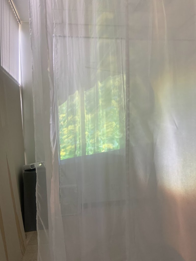 When hearing everyone’s group project proposals for class, I was very excited to join Adriana’s group. What Adriana had proposed, was to create an immersive experience using video and sound. To create Adriana’s vision, the group took over a small room in the back of the printmaking studio and hung curtains from the ceiling going in different angles to create a maze for the audience to walk through. We had two projectors at opposite ends of the room to project onto the curtains to play our video which was compiled of different clips that included the observation of nature.