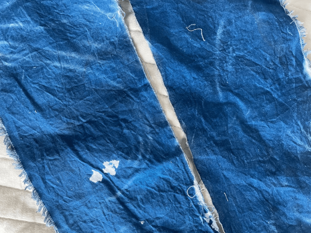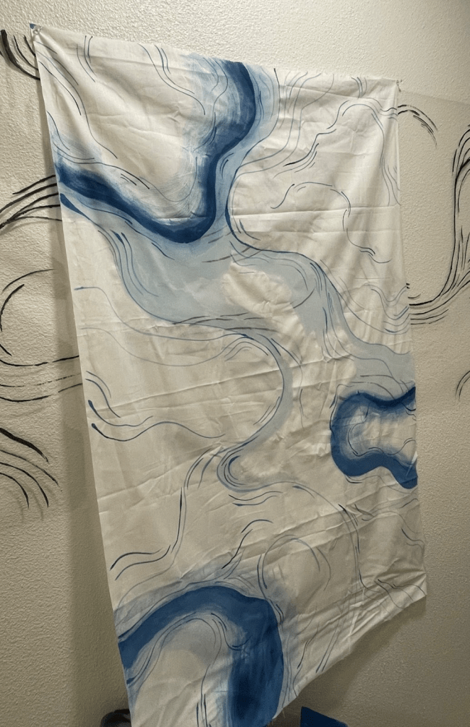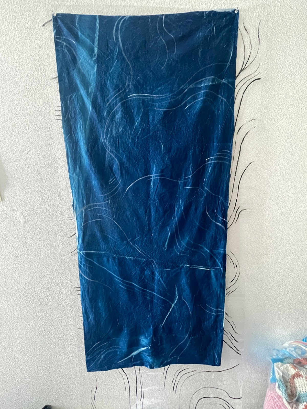 The first thing that I did was research what fabrics work best with cyanotype and found that cotton is one of the better materials to use. From there I purchased the fabric and began experimenting with painting on the fabric. I used watered down acrylic paint to paint on the fabric. On these panels I also glued on yarn as more lines that would then hang down to the floor.