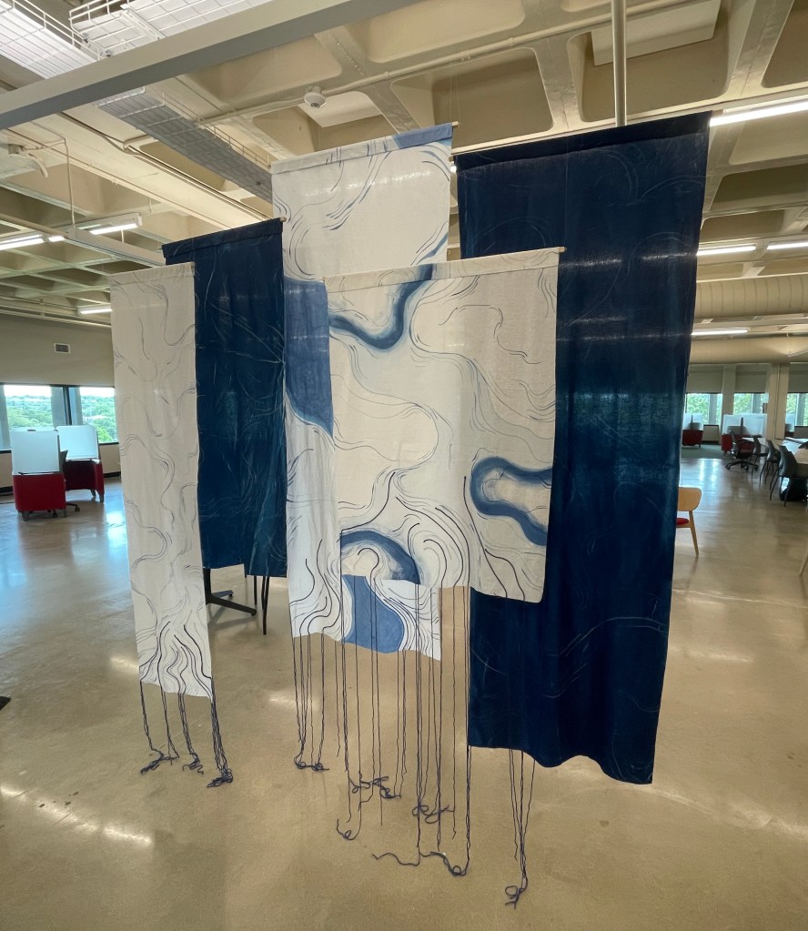 For my individual project I decided to make something that was hanging because I enjoyed making the earlier translucent assignment, so I wanted to explore making a larger version. Like with that project I wanted this one to also be monochromatic and blue. With the lines on each panel I wanted to play with the idea of something that felt like it flowed and and also was entangled which is why I chose to also use yarn that would hang and be bunched up on the floor.