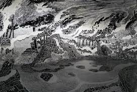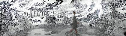 “Paradise” is a large-scale, three-dimensional installation created by Oscar Oiwa in 2017. The installation consists of a giant inflatable dome, measuring 12 meters in diameter and 6 meters in height, that is entirely covered in a mural drawn by the artist. The mural depicts a surreal and fantastical landscape with lush vegetation, winding rivers, and towering mountains. The landscape is rendered in black and white, giving it a dreamlike quality and creating a stark contrast with the white walls of the inflatable dome.