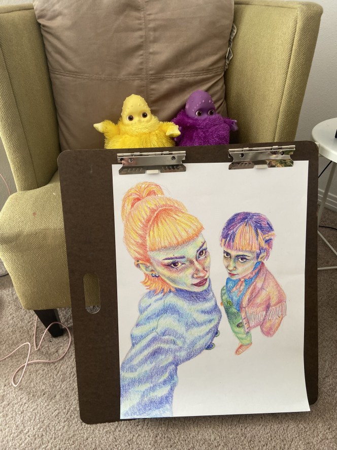 For this project I wanted to choose an image in 0.5 lens. I love taking these photos and the distortion it creates for an image. I chose this picture of my sister and I, and I wanted to draw it in my style. I use crayons to create the shading and add value through color. Working with color is my go to and it is easy to understand for me. It hasn’t been finished yet, but I want to add fish in the background, and transform it into a different space. Rather, that create an work that is just true to the reference image. I plan on using watercolor to create contrast with the image focus of the people.