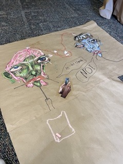 for my individual project I decided to do a large drawing. I started over a lot of times because I couldn’t really decide “what” I wanted it to be. First I thought large panels of scribbles, but then I realized I could really do something I WANTED to do. From there I started drawing characters and just kind of went with whatever I felt was working. Honestly, with projects like this, it’s hard for me not to be happy with out it turns out, but they always feel like I could do more. I feel like with this I did what I wanted to do. I used sharpie, pastels, hot glue, string, collage, and cotton stuffing stuff. I really wish I had had white news print, but I feel like the brown works well with the pastels. I can see why someone would think this looks. like a kid drew it or something, but I think thats’s the part of it that really makes it uniquely mine. Overall I think I was happy with it, I’m still on the fence.