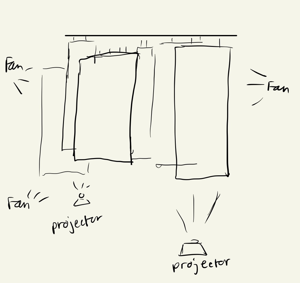 My group and I first began by locating a specific site where we would like to install this project. We ended up choosing the closet in the back of the screen printing room since it was very spacious and allowed for easy access to outlets. We cleaned it out and covered the walls and windows with some panels that were in there. We also decided to cover the windows from the screen printing room to allow for minimum amount of light from the outside to come in to allow viewers to see the projection best although, the long windows in the right side still had some light coming in. After this we used the super long tall latter to begin clipping some “clippers” to the ceiling panels. We tied the fishing line from these clippers to the metal rods which is how we were able to hang the sheer curtains.