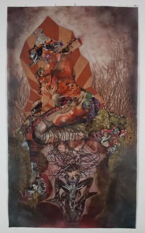 I really liked the vintage feel of the two materials mentioned earlier, so I tried to further emphasize that feeling through the entire piece. I chose to include images that felt old, nostalgic and maybe even a little unsettling to make the viewer feel like they were looking at something from the past, like artwork left behind in an antique shop. Overall, I’m happy with how this piece turned out, from the colors, to the material, to the emotions evoked.