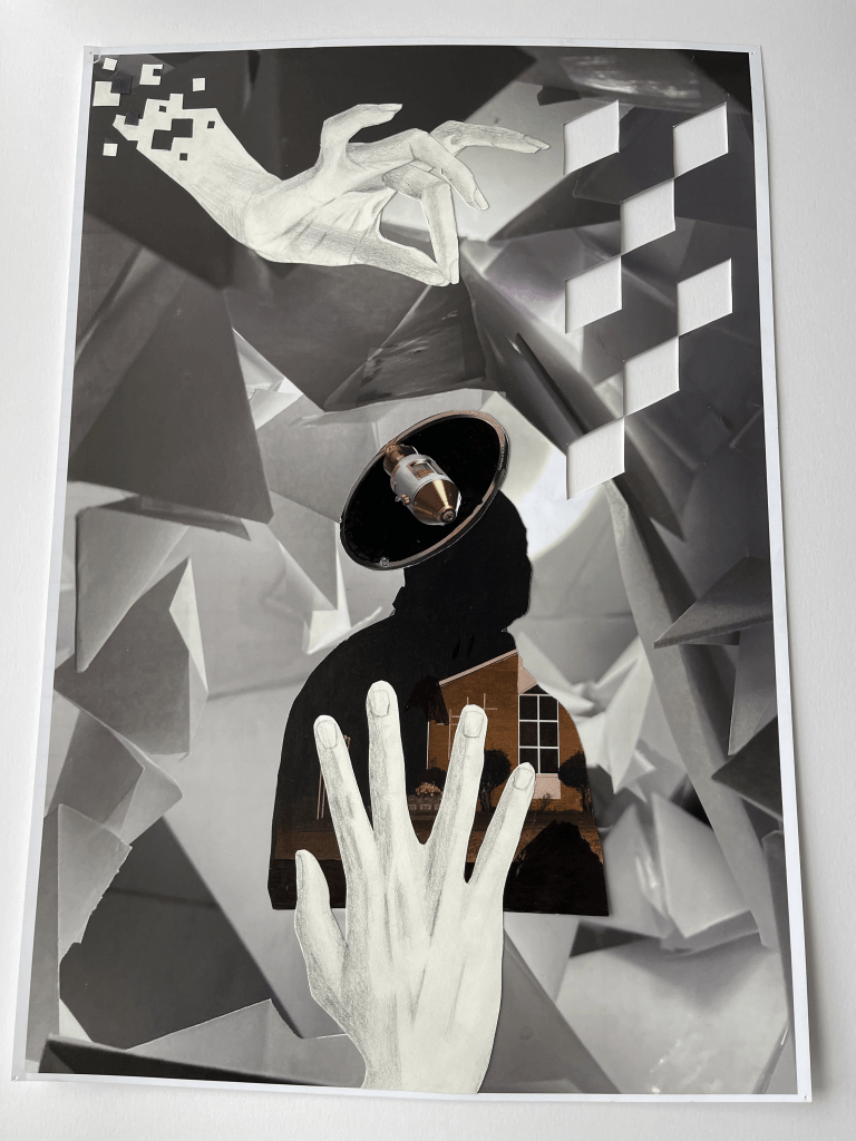 aim of this project was to depict a puppet that was controlled by a hand to tell a story. The puppet is shown falling and having some of its threads broken, suggesting that it is freeing itself from its controller. We chose to portray the strings and wire figures with line, enhancing the “line” aspects by using a continuous line method akin to blind contour drawing. Although putting the installation on the wall is more visually appealing, our original idea called for laying the installation on a surface with a counterbalance in the arm. We strengthened the installation by suspending fishing thread from the ceiling and fastening it to the wall with thumbtacks to assure its stability.