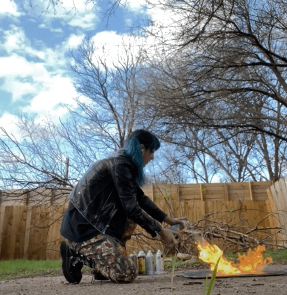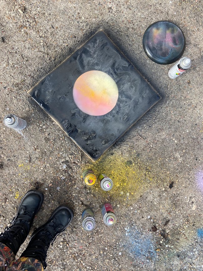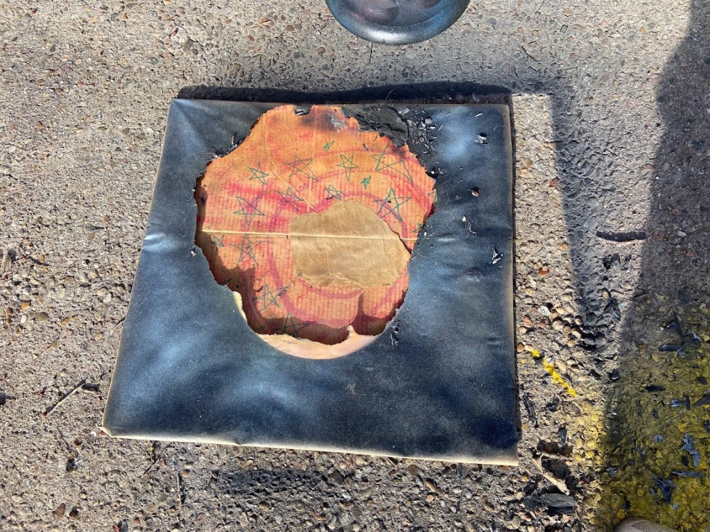 I started my collage by harvesting some cardboard from an amazon box, then I rubbed some watercolor paint on there with a paper towel. With some crayon markers, I started drawing on the cardboard– just simple stars and spirals. I then taped some brown paper over the cardboard and spray painted it. After I finished painting the paper, I burned a hole in the center so the cardboard would show through.