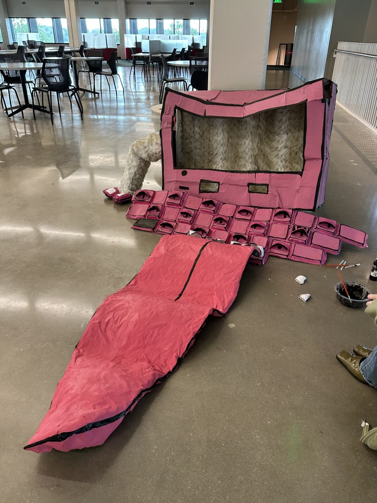 The keyboard went well but the computer face itself started to warp because of the moisture from the paper-mache. It was here that I decided I really needed to push the idea that this is not meant to be realistic but lives in alternate cartoon world. I started the painting process where I painted the whole thing black and then used pink to outline the edges but this did not give the effect of a 2D cartoon in a 3D world so I went back and repainted the whole thing pink. After everything was painted and the outlines were drawn I was still unhappy with it. It didn’t give any of the imagination that I wanted it to and it fell flat. I then decided to add fur to the inside of the computer. Once that was done it began to come alive; with the animal print inside I thought to make this into a living thing. It was then that I started to paint eyes onto the keyboard keys but even then it fell flat. I then started making 3D eye lids to put atop the painted eyes and it started to feel better. It was after our final crit that I spoke about wanting a large tongue exiting the spacebar mouth. So in the final hours of the project I made a 3-4 foot tongue. This was a hasty decision but really brought the piece together in my opinion. It allowed for a more experiential piece, one that you have to interact with as you walk around.