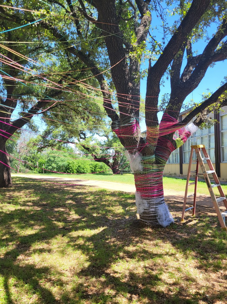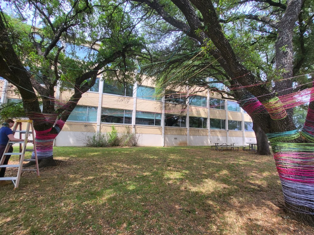 Before we could begin our project, we had to find two trees that were close to each other and tall enough to wrap yarn and lights around the branches. However, we had to find trees that were close to the fine arts building, since we couldn’t go out too far. After we decided on which trees to use, we started wrapping yarn around each tree.