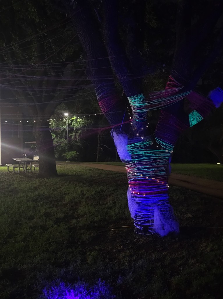 Once we were done with the yarn, we started making the chicken wire shapes and spray painted them white. Once they were done drying, my teammates placed each one on a different side and angle of both trees while I gave them yarn to wrap around the shapes to keep them steady. After that, we wrapped the lights around the tree branches and trunk and connected them together in the center of the yarn. And lastly, we plugged in our black lights inside the fine arts building and tested them out to make sure they worked. But as a bonus, for the past few days, I’ve been making sure no one stole the black lights or took the lights and yarn off the trees. I’ve also tested the black lights at night with one of my teammates. My team and I are proud of how this project went, and I hope it doesn’t immediately get taken down once the semester is over.