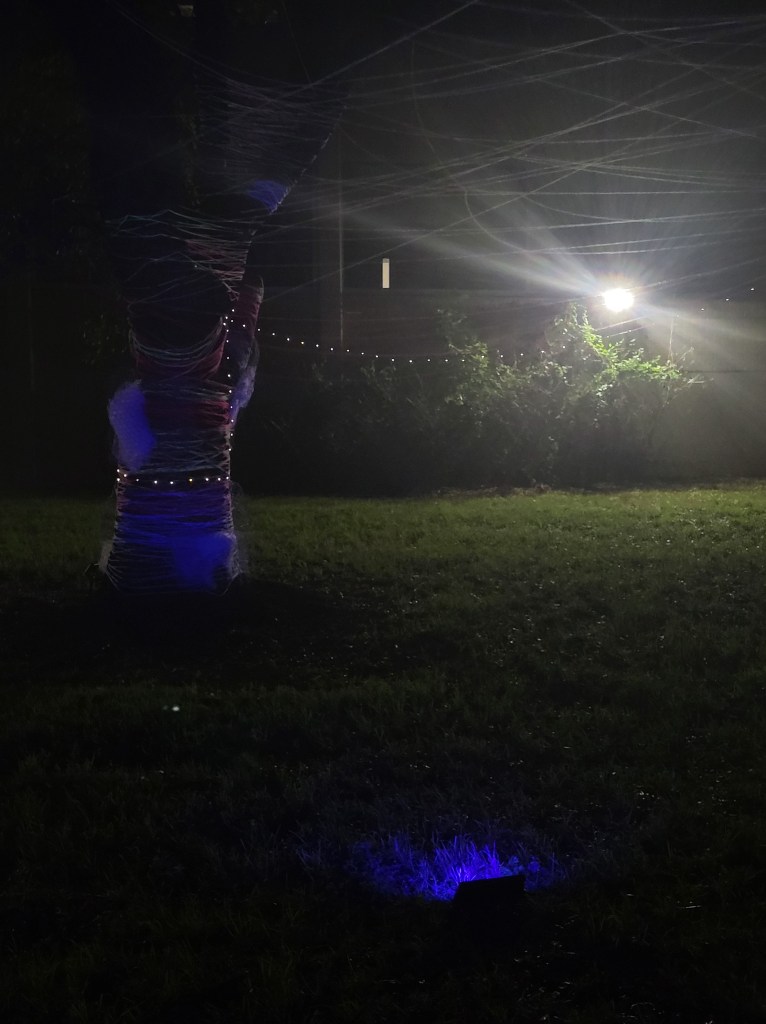 Some of the yarn was neon, so that when we finally plugged in the black lights they would glow in the dark and give more light. Once we wrapped yarn around the tree’s trunk, I decided I would throw the yarn around some branches to make a crazy fun web. I got the yarn stuck a few times, but with the help of my teammates we got it out (No yarn was injured during this project).